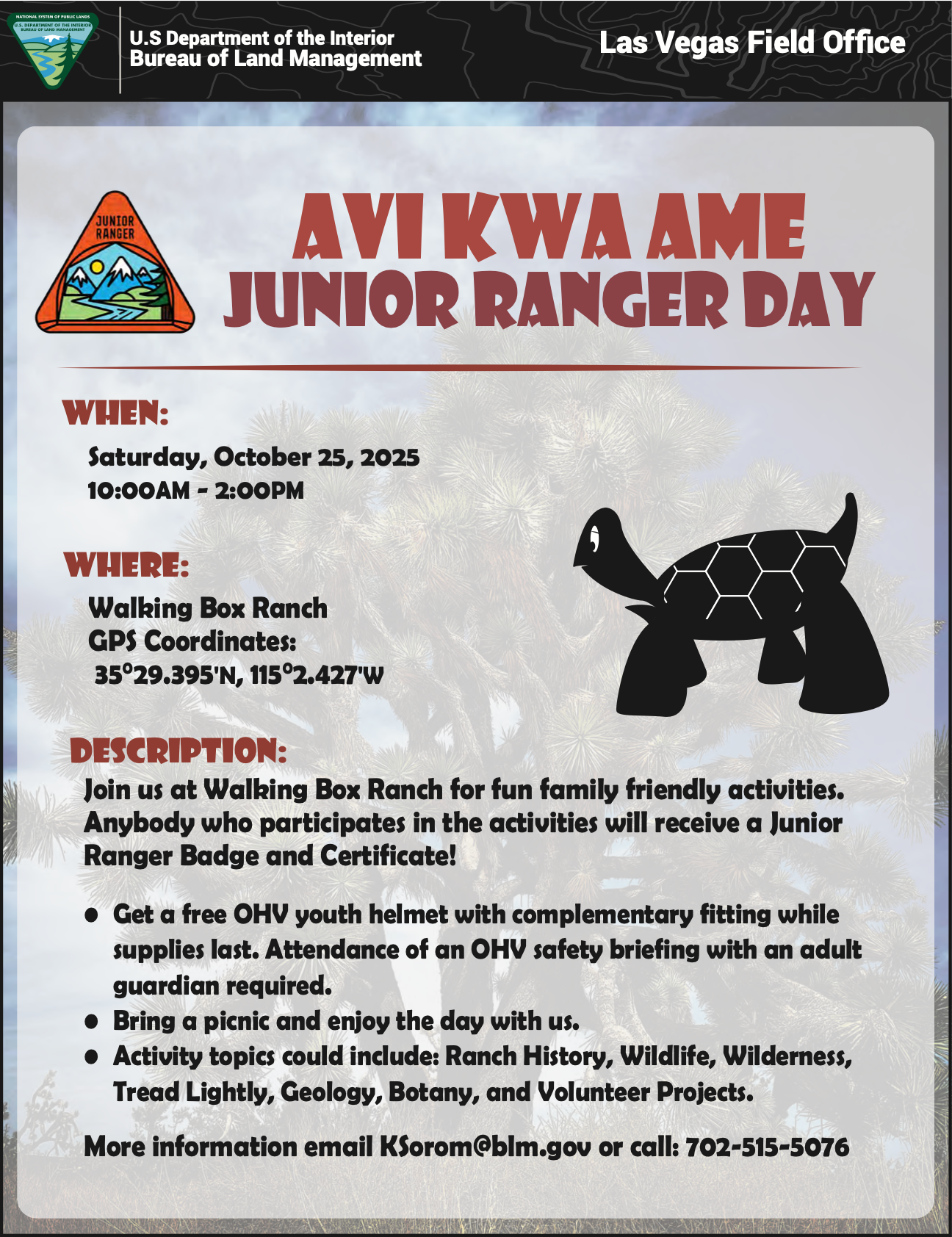 AVI KWA AME JUNIOR RANGER DAY Saturday, October 25, 2025 10:00 AM 2:00 PM Walking Box Ranch Walking Box Ranch Road NV, 89046 United States (map) Google Calendar ICS