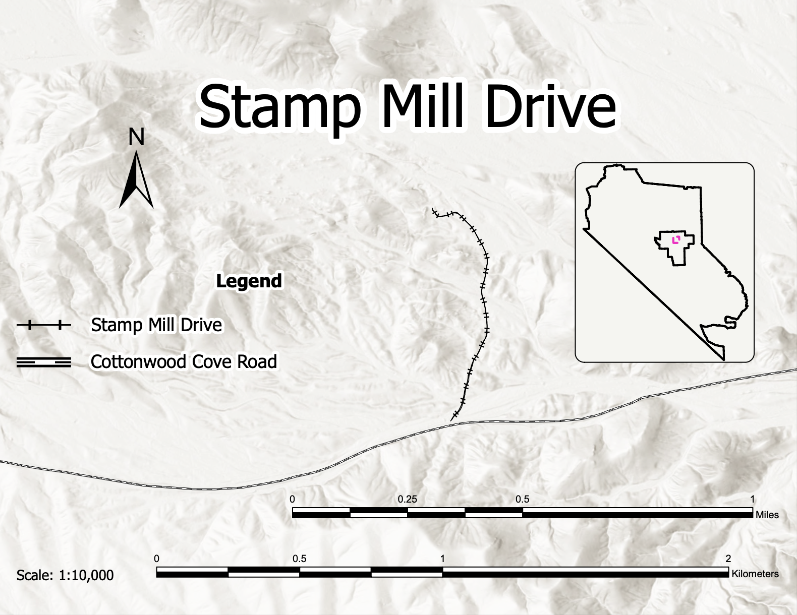 Turn left on the Cottonwood Cove Road in Searchlight. At mile marker #2, turn left on the dirt road about 100 yards from the mile marker. The road is in good shape and generally can be done in a sedan. The stamp mill is a half-mile on that road.